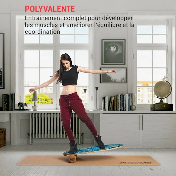 - Complète : planche d’équilibre Indoor avec tapis de protection de sol et rouleau de liège