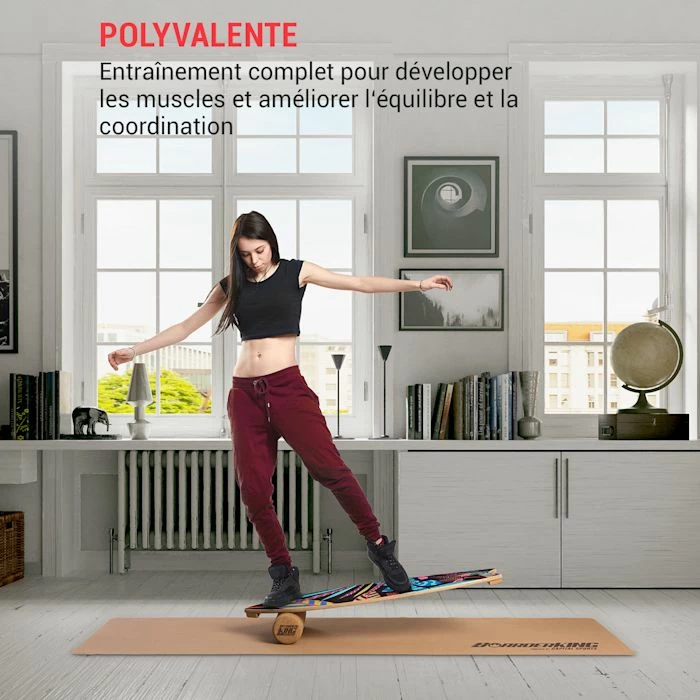 - Complète : planche d’équilibre Indoor avec tapis de protection de sol et rouleau de liège