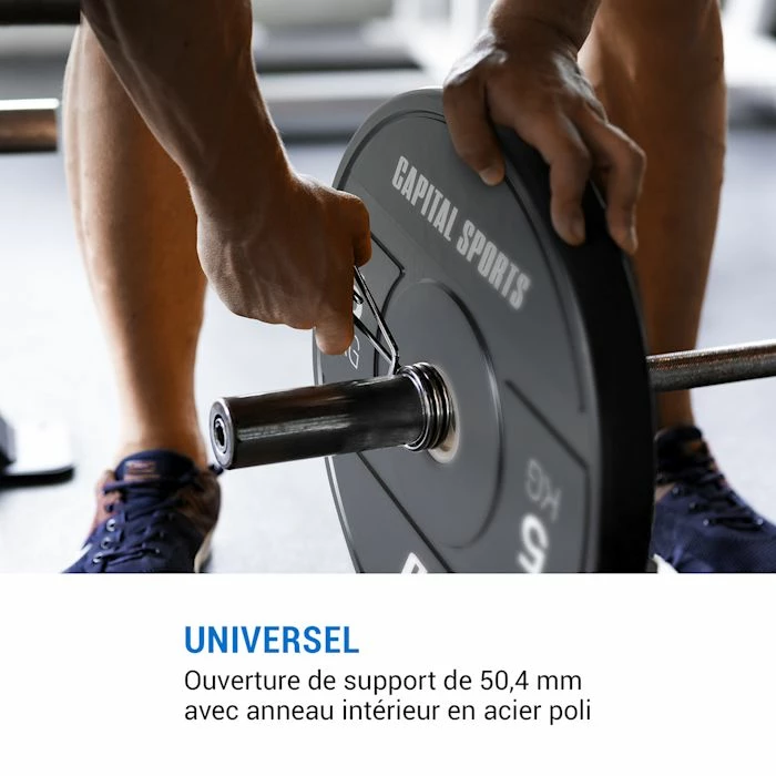 Durables, résistantes à l’usure et supportant la charge : ce sont les Bumper Plates Elongate Capital Sports. En caoutchouc dur de qualité avec une ouverture de 50,4 mm, elles fournissent le poids souhaité pour vos entraînements de cross-training ou de barre olympique. Le support est protégé par une bague intérieure en acier spécialement lissé pour que les disques de poids glissent en douceur sur la barre et ne pas endommager les supports lors des lâchers de barre.