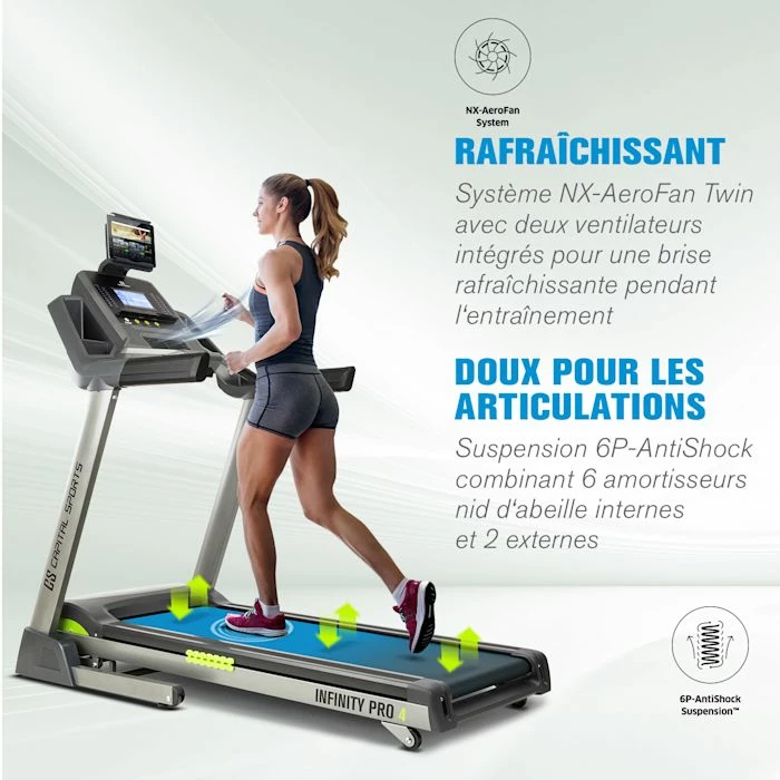 Courez en toute liberté, avec la série de tapis de course Infinity de CAPITAL SPORTS, votre entraînement cardio se transforme en une expérience de haut niveau ! Le tapis de course CAPITAL SPORTS Infinity Track 4.0 vous offre une technologie de pointe pour votre entraînement cardio et à l’endurance avec une bande de roulement extra-large, et y associe des fonctionnalités d’interconnexion telles que l’intégration complète de l’application Kinomap avec feedback Bluetooth. Il propose également de nombreuses fonctionnalités avancées telles que le NX-AeroFan Twin System pour avoir en permanence de l’air frais et vous rafraîchir, des enceintes intégrées et le système de suspension 6P-AntiShock combiné pour une marche très naturelle qui vous fera presque oublier que vous êtes en train de faire du sport – quelles que soient la météo ou l’heure de la journée !