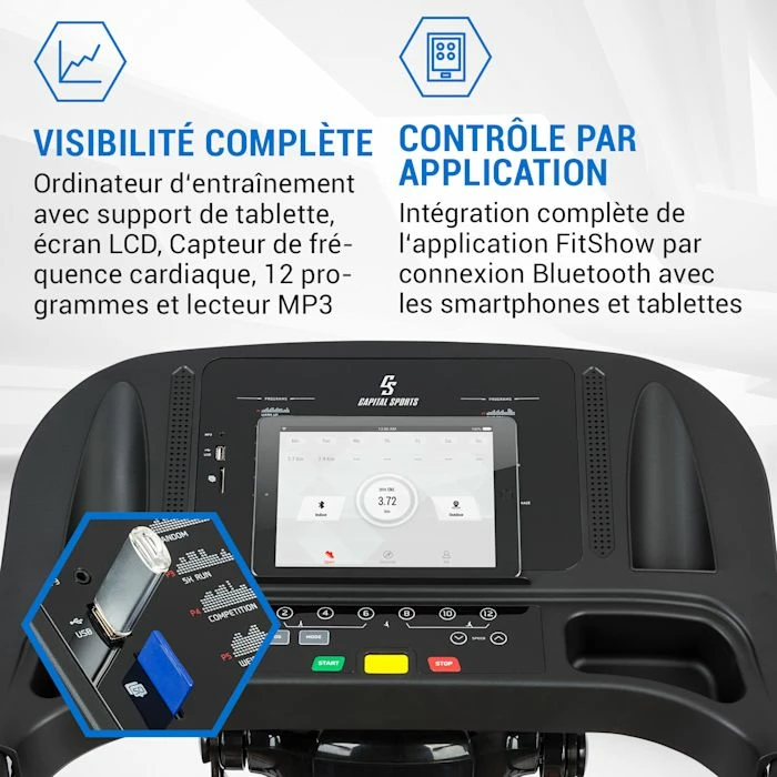 - Visibilité complète : ordinateur d’entraînement avec support de tablette, écran LCD, capteur de fréquence cardiaque, 12 programmes et lecteur MP3