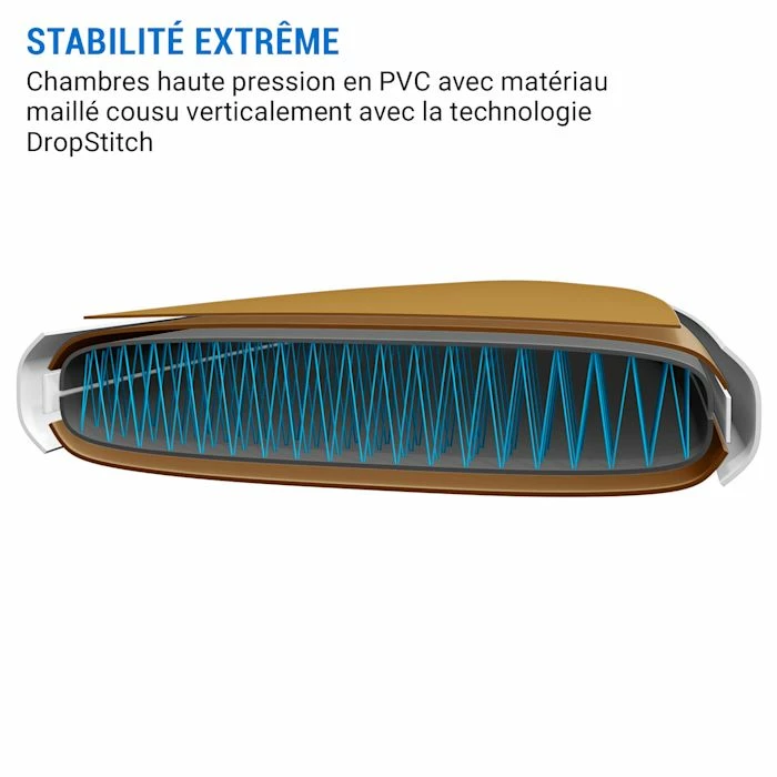 - Stabilité extrême : chambres haute pression en PVC avec maillage cousu verticalement avec DropStitch Technology