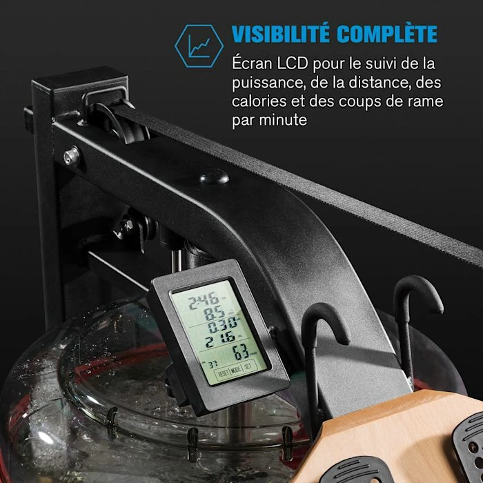 - Visibilité complÚte : écran LCD pour le suivi de la puissance, de la distance, des calories et de la fréquence des coups de rame par minute