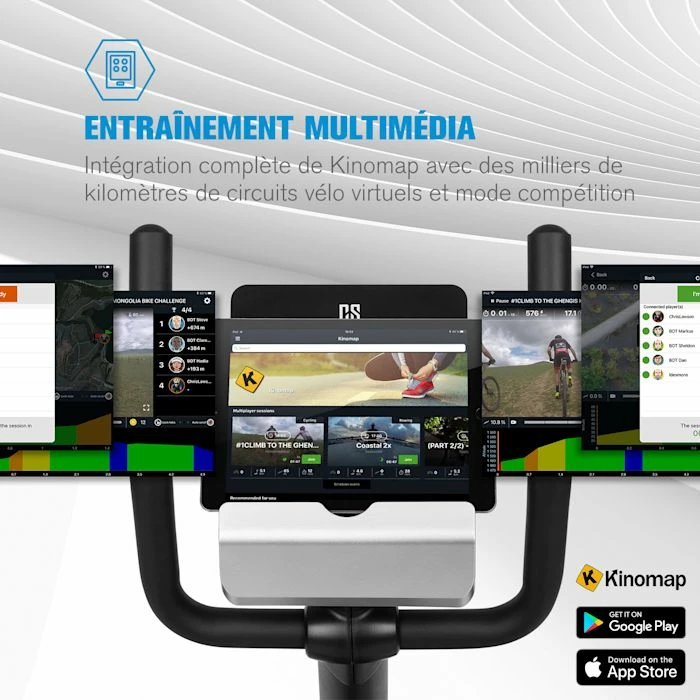 - Entraînement multimédia : intégration complète de l’application Kinomap avec des milliers de kilomètres de circuits vélo et mode compétition