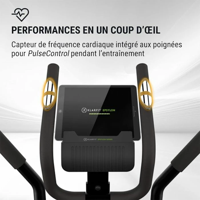 - Performance contrôlée : capteur de fréquence cardiaque intégré aux poignées pour PulseControl pendant la séance d’entraînement