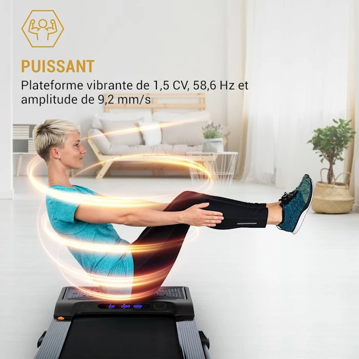- Puissant : plateforme vibrante de 1,5 cv, 58,6 Hz et amplitude de 9,2 mm/s