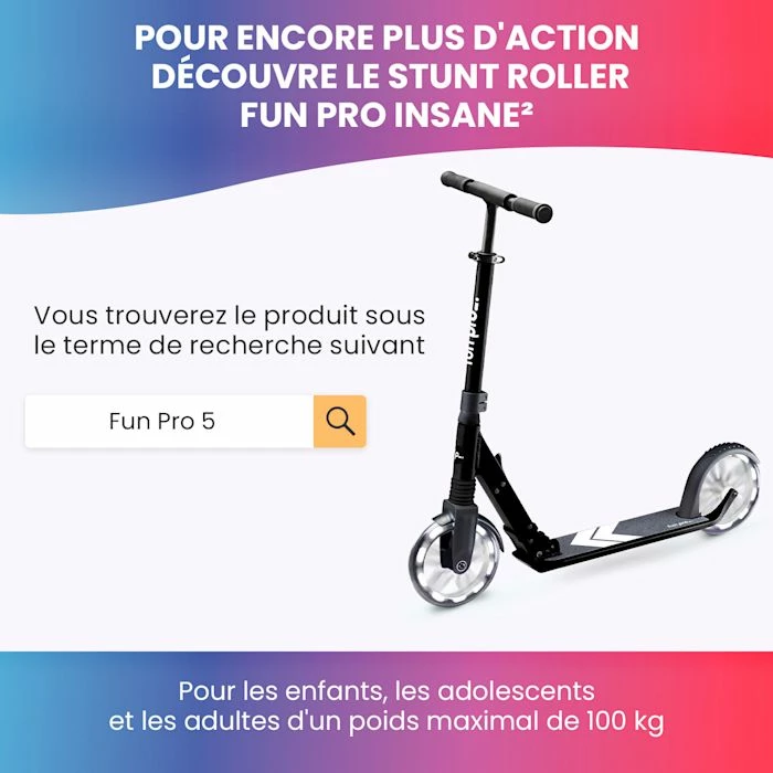 Le plaisir de la trottinette pour les grands enfants ! Notre trottinette enfants fun pro THREE convient à tous les enfants et adolescents de 6 à 18 ans qui préfèrent une trottinette à 2 roues. La trottinette supporte un poids allant jusqu’à 100 kg et possède un guidon réglable en continu de 74 à 93 cm : idéal pour les tailles de 110 à 160 cm. Le guidon se replie facilement et même les extrémités du guidon se replient aisément vers l’intérieur. Les deux mécanismes sont optimisés, s’ajustent très proprement et ne claquent pas pendant la conduite. Ainsi, la trottinette est vraiment adaptée aux transports en commun et prend peu de place. Une sangle facilite également le transport. Les roues en PU d’un diamètre de 120 mm avec roulements à billes ABEC 9 offrent une grande propulsion tout en étant maniables et légères. Comme toutes nos trottinettes, la trottinette fun pro THREE dispose d’un frein à friction sur la roue arrière qui assure la sécurité nécessaire. Une béquille pliante facilite le stationnement et protège le guidon des frottements. Conformément à la norme DIN EN 14619 : 2019, la trottinette répond à toutes les exigences techniques de sécurité et aux méthodes d’essai de la classe A pour les trottinettes destinées à être utilisées comme engins de sport à roulettes sur la voie publique.