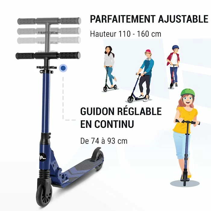 - Particulièrement flexible : avec guidon rabattable et réglable en continu en hauteur