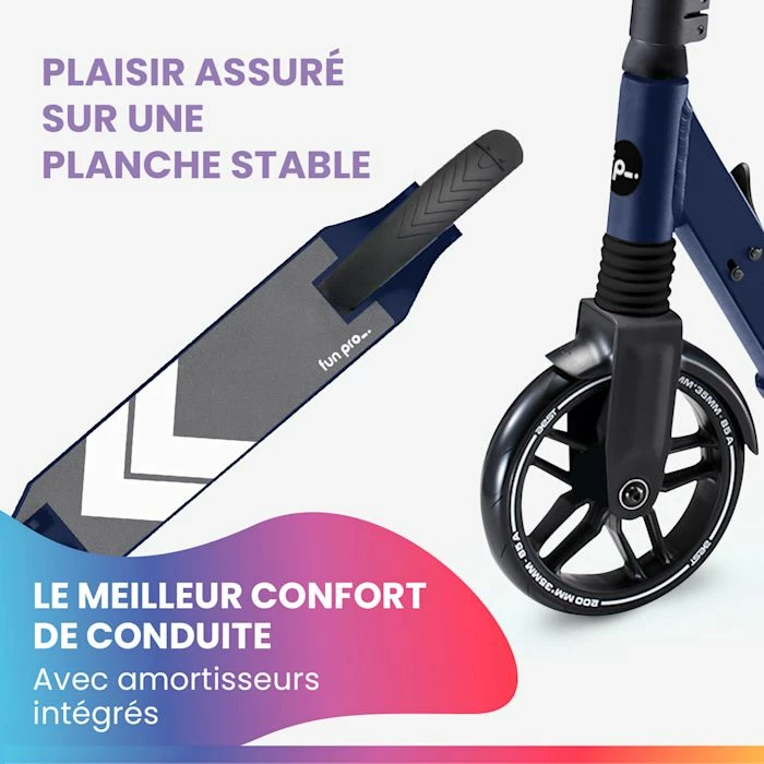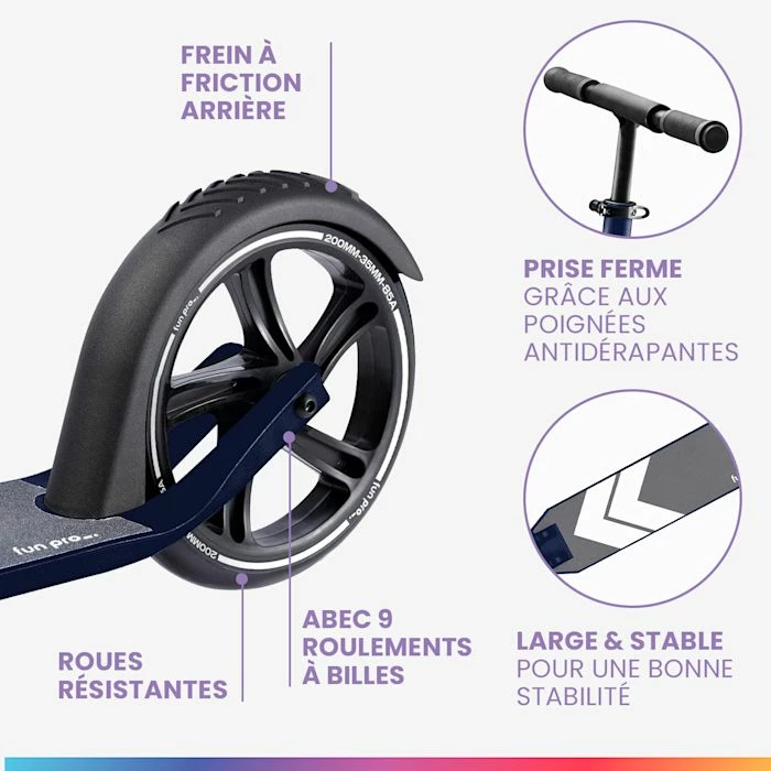 Let´s cruise! Grâce à sa bonne maniabilité, la trottinette FIVE de fun pro est ton compagnon de route pratique, avec lequel tu peux parcourir tous tes trajets avec rapidité et plaisir. Les roues glissent sur le roulement à billes ABEC 9 et t’offrent beaucoup d’adhérence grâce à leur largeur supplémentaire. Sûr et agile, tu peux filer à travers la ville ou le village avec la fun pro FIVE ou profiter de tes loisirs de manière sportive, car elle est faite pour toi : selon ta taille, tu peux régler la hauteur du guidon de 88 à 106 cm. Un confort et une sécurité supplémentaires te sont offerts par le très grand marchepied et les poignées ergonomiques, et le frein à friction arrête la conduite avec une grande puissance.