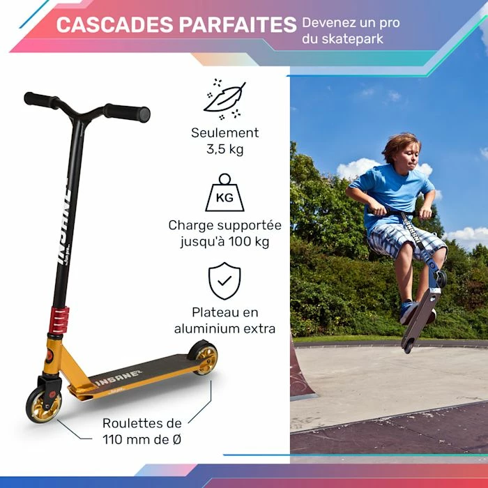 - Pour enfants et adultes : trottinette stunt robuste avec un poids de charge de 100 kg max.