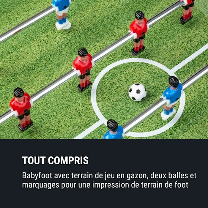Que le jeu commence! Klarfit Spin transforme votre salle de séjours, chambre d’enfant ou salle de fête en salle de billard ou en terrain de football, amusement garanti! Que vous soyez seul, en famille ou avec des amis, divertissez-vous lors d’une bonne partie de billard ou lancez-vous dans une folle partie de kicker. Grâce à sa fonction rotative à 180°, le kicker se transforme en un simple tour de main en une table de billard et vice-versa.
