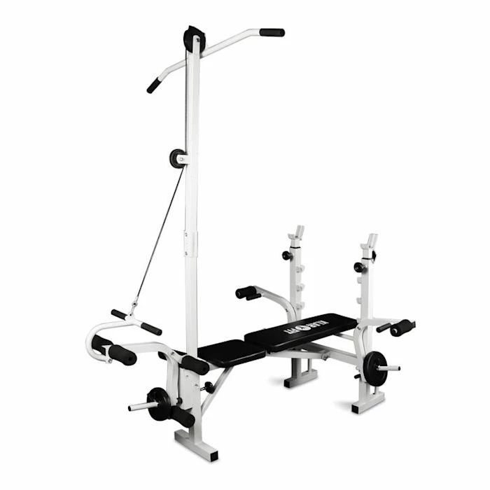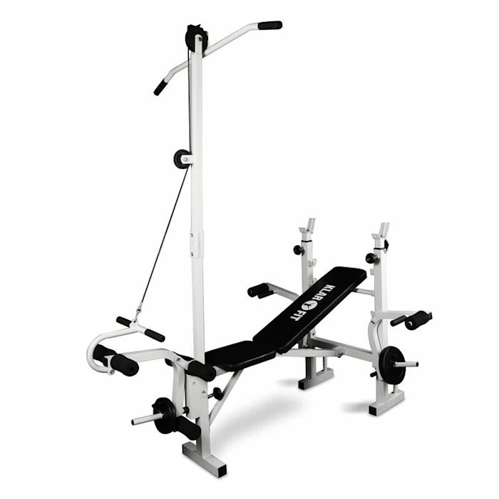 Le banc de musculation Klarfit est un véritable centre d’attraction tout fait de métal, dont les principales attractions sont un haltère long, une tour de musculation du dos et des Curlers pour les bras et jambes – en bref, de quoi entretenir et former tous les groupes musculaires de façon complète et individualisée, cela à peu de frais.
