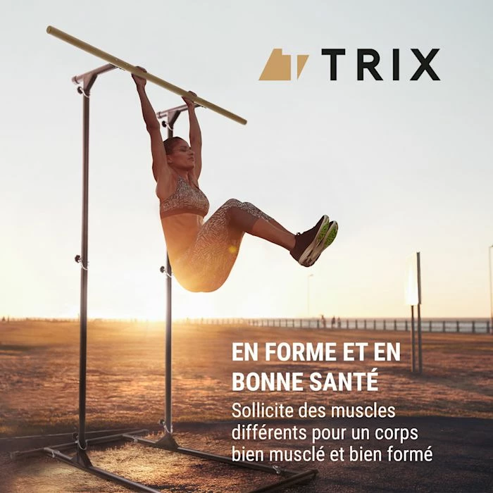 Pour avoir un corps musclé ! Bras, épaules, muscles abdominaux et dorsaux bien entraînés – aucun problème avec la station de traction Klarfit T-Trix. Grâce à sa conception modulaire, le solide appareil en acier sablé avec une barre de traction en hêtre massif s’installe très rapidement et est prêt pour l’entraînement immédiat. Avec une charge supportée allant jusqu’à 110 kg, la barre convient à presque tous les athlètes. Avec le Concept MultiGym , le T-Trix est parfaitement adapté pour les Pull Ups ou Chin Ups avec sa hauteur maximale de 190 cm, et s’adapte tout autant pour les dips avec sa hauteur minimale de 114 cm. Pour encore plus de variété dans vos entraînements, vous pouvez utiliser la station de traction T-Trix , au sol pour des grandes tractions ou des pompes classiques. La construction en acier robuste assure à tout moment une grande stabilité, encore améliorée par un renfort de châssis à trois pieds. Une fois l’entraînement terminé, la station se démonte simplement et vous pouvez alors la ranger en pièces détachées dans un sac de transport ou la déplacer confortablement.