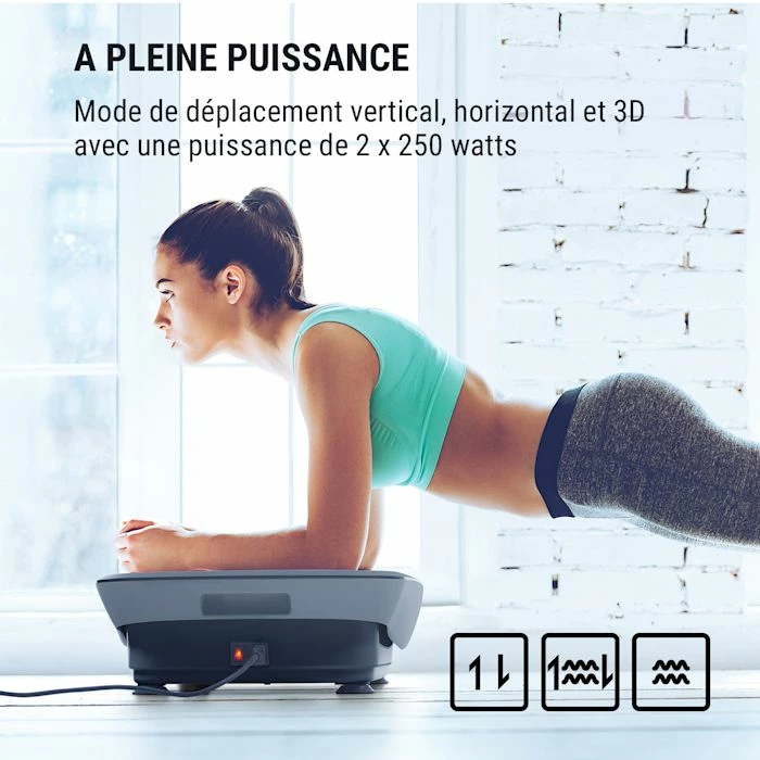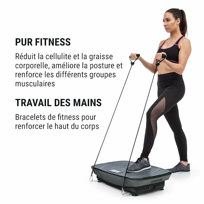 L’entraînement par vibrations avec 3 modes de mouvement, 20 vitesses et 3 programmes prédéfinis active différentes zones du corps sans forcer les ligaments ni les articulations. En particulier, le renforcement des muscles du dos et du bassin favorise une posture droite et améliore également la marche. Mais ces exercices permettent également de traiter efficacement les groupes musculaires profonds inutilisés. Cependant, la plateforme vibrante ne développe pas seulement le muscle, mais est également idéale pour raffermir la peau et les tissus conjonctifs, et aide à réduire la cellulite et la graisse corporelle. En outre, elle stimule le système circulatoire et améliore l’équilibre général.
