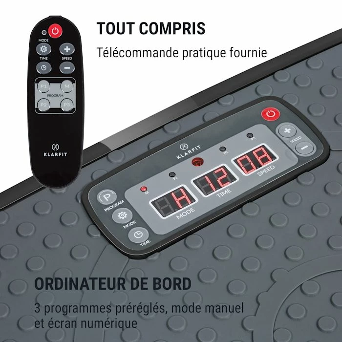 Pour cibler différents groupes musculaires, il suffit de modifier votre propre position. A cet effet, des zones marquées sur la zone antidérapante permettent le positionnement optimal des pieds pendant l’entraînement. Grâce au MaxComfort Training et à la zone d’entraînement de 72,5 x 42 cm, vous pouvez effectuer de nombreuses variations d’exercices en position debout, assise ou allongée. De plus, les deux bandes de fitness incluses dans la livraison permettent de nombreux exercices d’étirement et conviennent particulièrement au renforcement du haut du corps avec des exercices tels que les « biceps curls ». Un écran LCD clairement agencé indique le programme d’entraînement défini, la vitesse et la durée, tandis que la télécommande fournie assure un contrôle confortable sans vous obliger à descendre de la plateforme.
