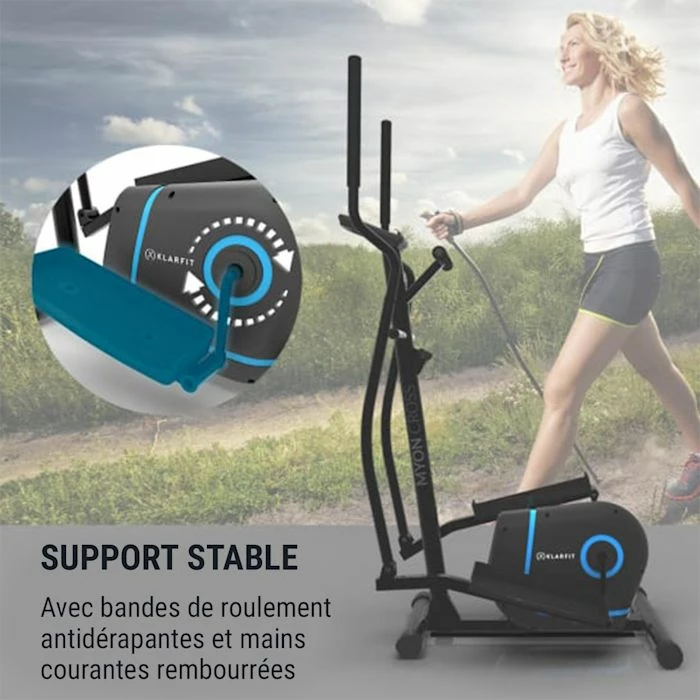 L’accès bas procure un grand confort, tandis que les larges bandes de roulement antidérapantes assurent la stabilité. Les montants du vélo elliptique sont pourvus de capuchons de protection en plastique pour éviter des dommages à votre le sol.