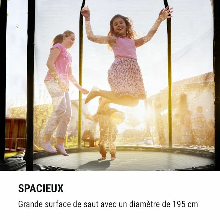 - Beaucoup d’espace : Grande surface de saut de 195 cm de diamètre
