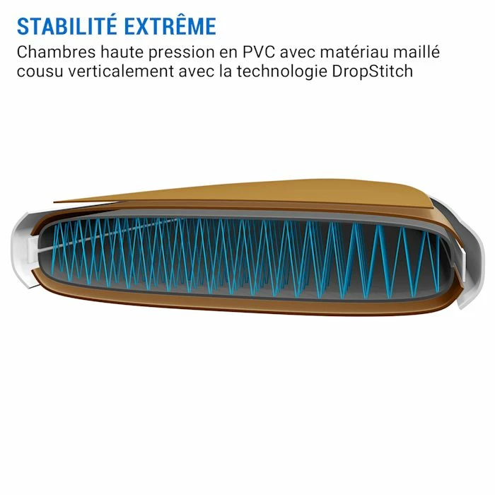 - Stabilité extrême : chambres haute pression en PVC avec maillage cousu verticalement avec DropStitch Technology
