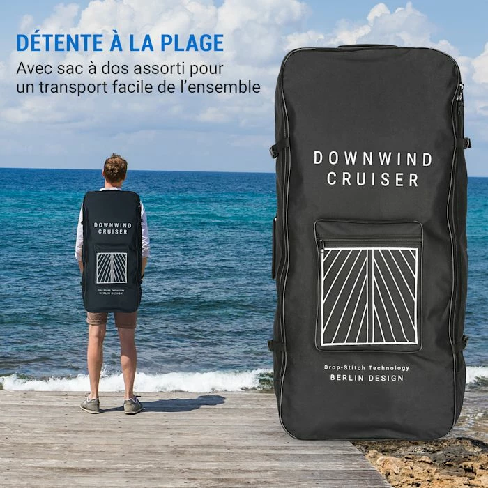 - Ensemble complet : comprenant la planche, la pompe, la pagaie télescopique, la ligne de sécurité, la palme, le kit de réparation et le sac à dos.