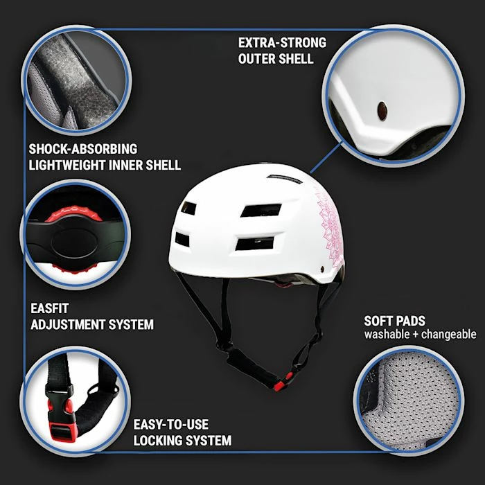 Toujours stylé et en sécurité sur la route ! Le casque de skate et de vélo de Skullcap by Capital Sports se compose d’une coque intérieure légère et anti choc en polystyrène expansé (EPS) et d’une coque extérieure robuste Microshell en polycarbonate à toute épreuve qui maintient le tout en place. Le système de ventilation avec entrées d’air assure suffisamment d’air frais. Les coussins souples intégrés lavables et remplaçables permettent en outre un confort maximal. Les casques demi-coque s’adaptent en souplesse à la taille grâce au système de réglage EASfit et s’ouvrent et se ferment facilement grâce au mécanisme de fermeture simple.